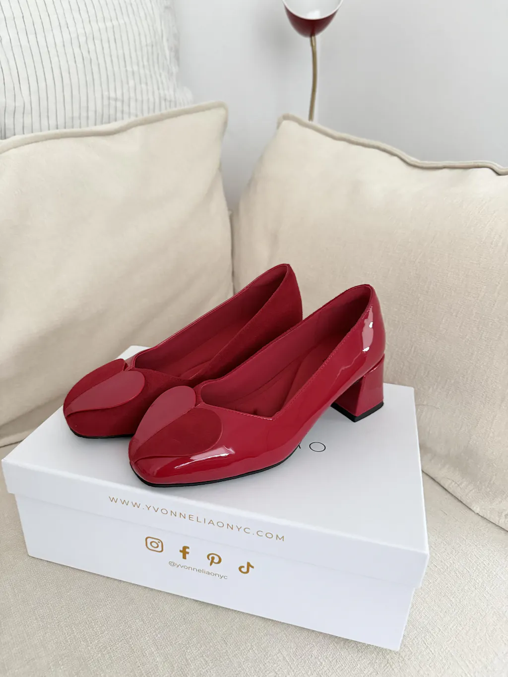 Meet your new love affair in shoe form. Essex block heels bring a playful twist to classic romance—crafted in glossy vegan patent leather with soft suede accents and oversized heart details that are impossible to ignore. Cushioned, removable insoles and a sturdy 2-inch mid-heel make them equal parts fun and practical, so you can strut comfortably all day. Dress up your favorite jeans, twirl into date night, or make a show-stopping entrance at a party—Essex heels say exactly what you’re feeling: love at first step.